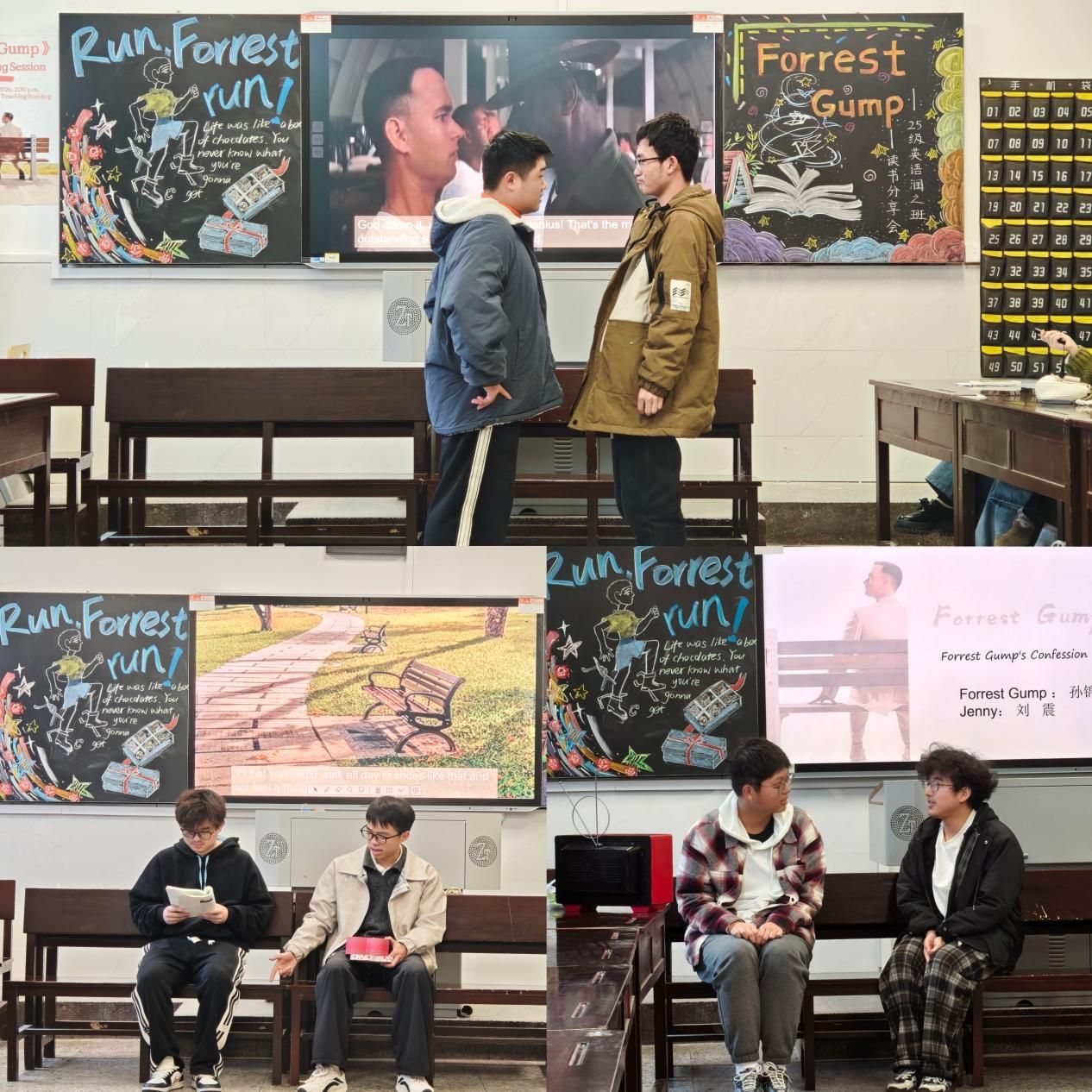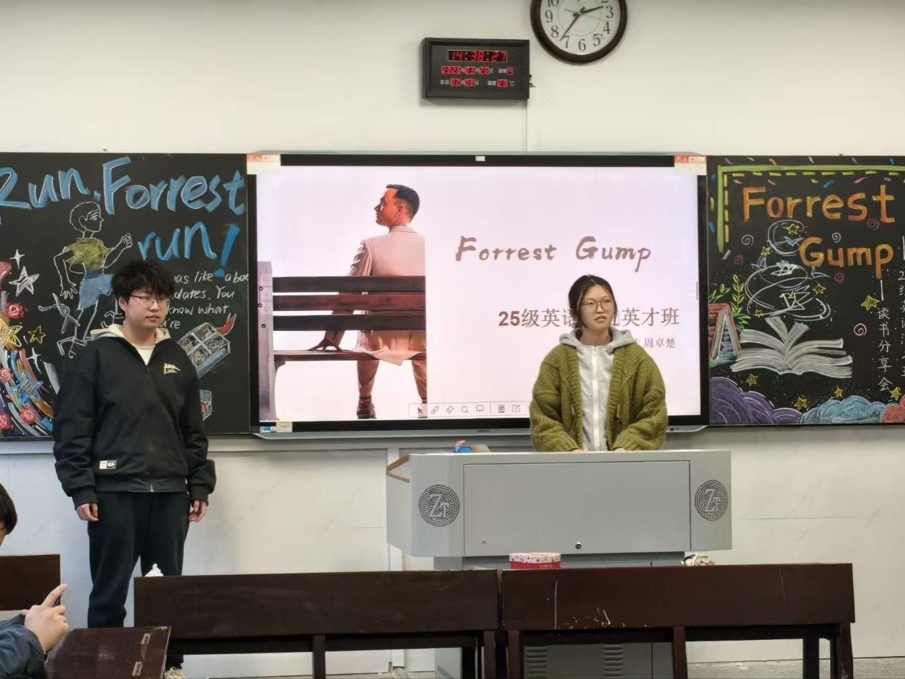 3月26日下午,25级英语润之英才班在城南校区教学楼408举办了一场以《阿甘正传》为主题的英文读书分享会,班主任蒋倩出席本次活动。活动通过情景演绎、文本解析与互动问答等环节,带领现场师生深入感受这部经典作品的文学魅力与精神内涵。