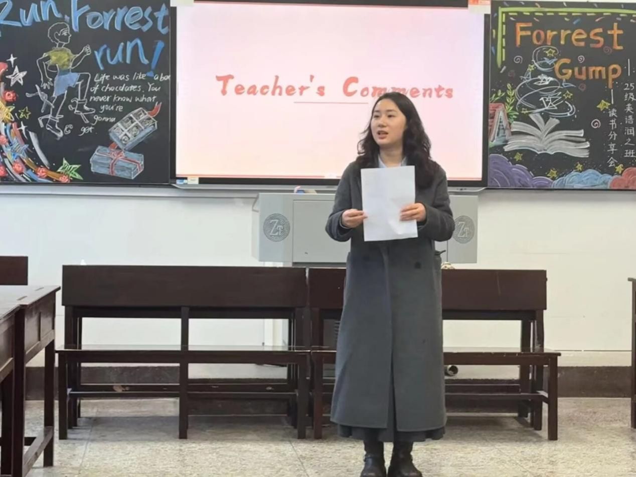 活动最后,班主任蒋倩对整场分享会进行点评。她充分肯定了同学们在演绎与讲解环节中的用心呈现与深入思考,并指出《阿甘正传》不仅是一部关于个人成长的小说,更是一面映照历史与人性的多棱镜,阿甘身上所体现的“专注”与“纯粹”对当下青年学子具有重要启示意义。她鼓励同学们在阅读中与经典对话,在思考中照见自我,将书中的精神力量转化为成长路上的坚定步履。