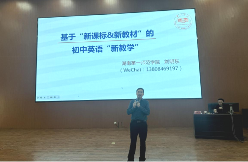 随后,刘明东教授给各位参训教师以及当地的初中英语教师带来了主题为《基于“新课标·新教材”的初中英语新教学》的专题讲座。基于新课标的要求和新教材的变化,刘教授强调初中英语新教学应该用教材来教而不应该简单地教教材,具体的教学中应该对标《义务教学英语课程标准(2022年版)》,坚持育人为本,以语篇研读为逻辑起点,做到基于文本解决知识建构化问题、深入文本解决知识功能化问题、超越文本解决知识素养化问题,从而实现从知识到能力再到素养的进阶,切实发展学生的英语学科核心素养。此外,在初中英语新教学中,还要践行英语学习活动观,做到“教-学-评” 一体化。