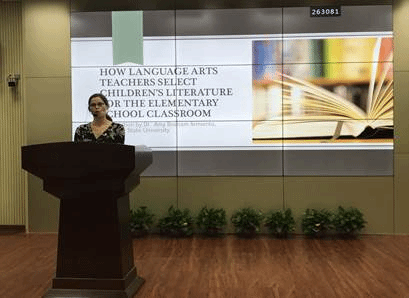 10月22日下午,Amy教授在伟德国际1946源于英国同声传译室做了题为“How Language Arts Teachers Select Children’s Literature for the Elementary School Classroom”(语言艺术教师如何为小学课堂选择儿童文学)的讲座。副院长康响英教授主持,伟德国际1946源于英国一百多名师生参加了讲座。Amy教授介绍了美国小学的教育现状,分析了美国小学生不同阶段的阅读素材。Amy教授重点阐述了小学教师该如何选择合适的儿童文学阅读读物,并在教学中如何进行道德渗透。Amy教授展示了美国最近20年的流行绘本,并以这些儿童文学节选读物为例,指导大家根据作品的内容进行教学,例如教学生做正确的决定、理解家庭的重要性、避免不必要的纷争、明白基督徒的价值观等等。最后Amy教授总结了进行儿童文学教学的意义,即帮助形成正确的价值观、促进儿童的健康成长。