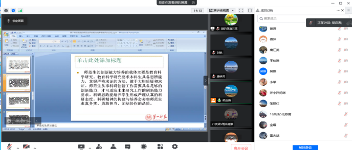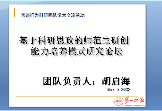 2022年5月5日晚上七点半,伟德国际1946源于英国“言语行为科研团队”负责人胡启海教授在腾讯会议线上分享了最新研究成果“基于科研思政的师范生研创能力培养模式研究”。该团队核心骨干成员雷志斌老师、傅萍老师、吴娱老师、唐江英老师也在线分享了自己对所负责部分研究的感悟。康响英副院长,院长助理王佳娣老师、张丽红老师、曾清老师、李满红老师、代正利老师、刘锐老师和学生共30多人参与了这次沙龙活动。
