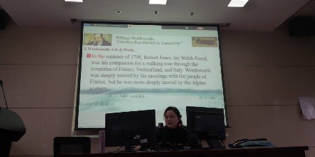 首先,欧老师从诗人的主要经历和创作生涯引入讲座主题。威廉·华兹华斯生于律师之家,是英国19世纪浪漫主义文学的先驱、“湖畔派”诗人的杰出代表、桂冠诗人。他与诗人柯尔律治共同发表的《抒情歌谣集》标志着英国浪漫主义文学的开端。华兹华斯一生对大自然景色和风光怀着神圣和特殊的感情,用平易自然的文字尽情抒发对大自然的热爱。然后,欧老师引导大家欣赏了华兹华斯的经典诗歌I Wandered Lonely as a Cloud。诗人在诗中歌颂了大自然的奇妙之美,同时也表达了自然之美所带来的心灵之乐。最后,欧老师总结了英国浪漫主义时期的文学特征,增进了同学们对英国浪漫主义文学的认识。