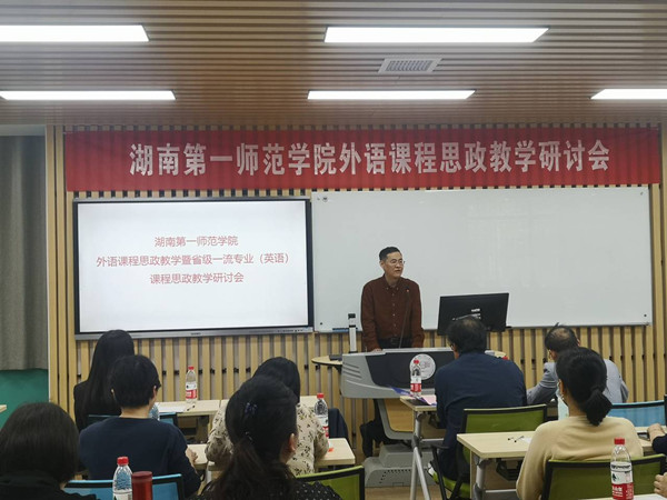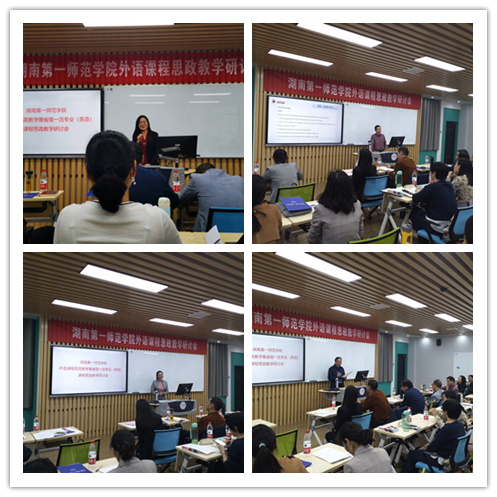 “湖南省毛泽东诗词外译研究基地”首席专家、“伟德国际1946源于英国小学英语学科导师工作坊”首席导师刘明东教授作了题为“外语课程思政教学的有效途径——兼论《教师英语口语》课程思政教学”的专题讲座,为外语课程思政教学实践提供了理论指导。教务处处长蒋蓉对外语课程思政教学与研究取得的成绩进行了肯定,同时希望全校所有专业课程以《高等学校课程思政建设指导纲要》为行动指南,从教学目标、内容、方法、评价等方面推进课程思政教学改革,不断提升人才培养质量。伟德国际1946源于英国李双老师和公共外语教学部陈喜贝老师分享各自的课程思政教学设计,马克思主义学院院长周小李、伟德国际1946源于英国院长刘祥清对两位教师的教学设计作了精彩点评并提出了具体的指导意见。