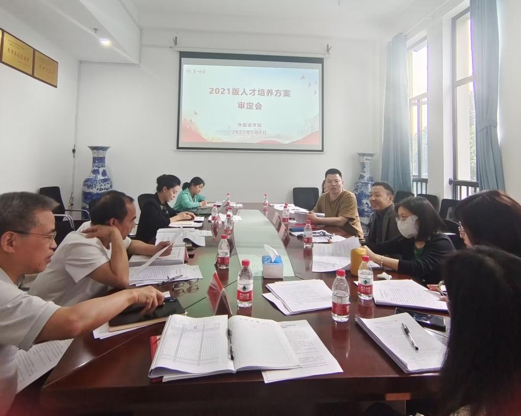 陈圣白致欢迎词。刘祥清对应邀参加本次审定会的两位专家表进行了简单介绍并强调,第一,方案修订应贯彻落实学校“两坚持 两拓展”方针;第二,研制科学、合理、高质量的培养方案对人才培养起着至关重要的作用;第三,人才培养需紧密对接中学需求。恳请两位专家对2021版英语专业(中学教育)人才培养方案修订稿多提宝贵意见。