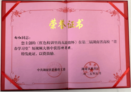 5月20日,第二届湖南省高校“青春学习堂”短视频大赛颁奖典礼在中南林业科技大学举行,我院副教授向红博士凭借作品《红色校训里的人民情怀》荣获教师组特等奖。