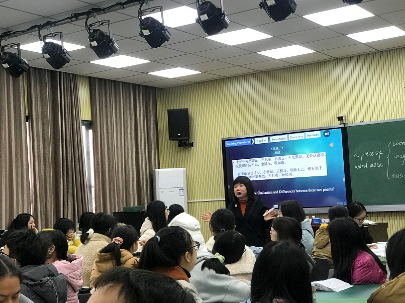 课堂上,王老师带领学生欣赏与学习了美国诗人爱伦坡的“Annabel Lee”,在传授英语诗歌的主题、意象、构成、语言等艺术特色的同时,注重课堂思政,提高学生对英美文学作品的判断能力。新颖的课堂设计、灵活的教学方法、优美的语言极大地激发了学生们的学习兴趣,学生们发言积极,课堂气氛非常活跃。