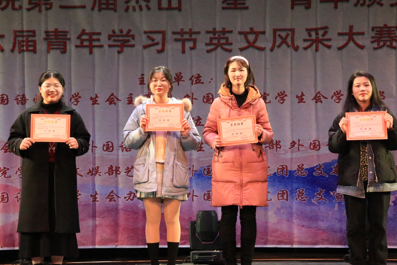 最终,在英语演讲比赛中,20英语1班邵海茗取得一等奖,18英语2班谢静文、19英语4班吴艺薇赢得二等奖,19英语1班言灵、19级810英语班陈笑取得三等奖;英语歌曲比赛中,《Light a fire 》荣获一等奖,《There's nothing holding me back》荣获二等奖,《The End of the World》和《Love Story》荣获三等奖;英语舞台剧表演中,19级813班廖丽组织的《The inheritance and transformation of love》荣获一等奖,20级841班表演的《LA LA LAND》荣获二等奖,20英语1班表演的《家有儿女2.0》以及19级810班表演的《The inheritance and transformation of love》荣获三等奖;毛泽东诗词朗诵中,20英语4班荣获一等奖,18英语5班荣获二等奖,20英语5班和19翻译1班荣获三等奖。最后,由评委老师为获奖者颁奖。