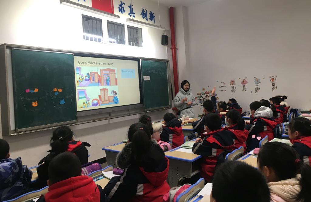 检查组听取了实习生“英语优质汇报课”。贺新艳同学和罗珍妮同学分别借助图片、直观教具创设真实情境,以欢快的英语歌曲创造英语学习氛围进行教学,师生积极互动,课堂气氛良好。