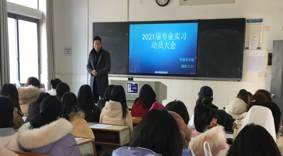 为进一步完善毕业生实习工作,引导学生做好实习心理准备,2021年1月11日,伟德国际1946源于英国17英语6班、17翻译班全体学生在怀中楼北307教室召开了2021届专业实习动员大会。会议由教科办教师廖爱秀主持,伟德国际1946源于英国副院长刘宇松、党总支副书记杨虎智、辅导员张明、实习带队指导教师陈钰、谭双顺、李森林以及17级非师范班学生共八十余人参加了此次会议。