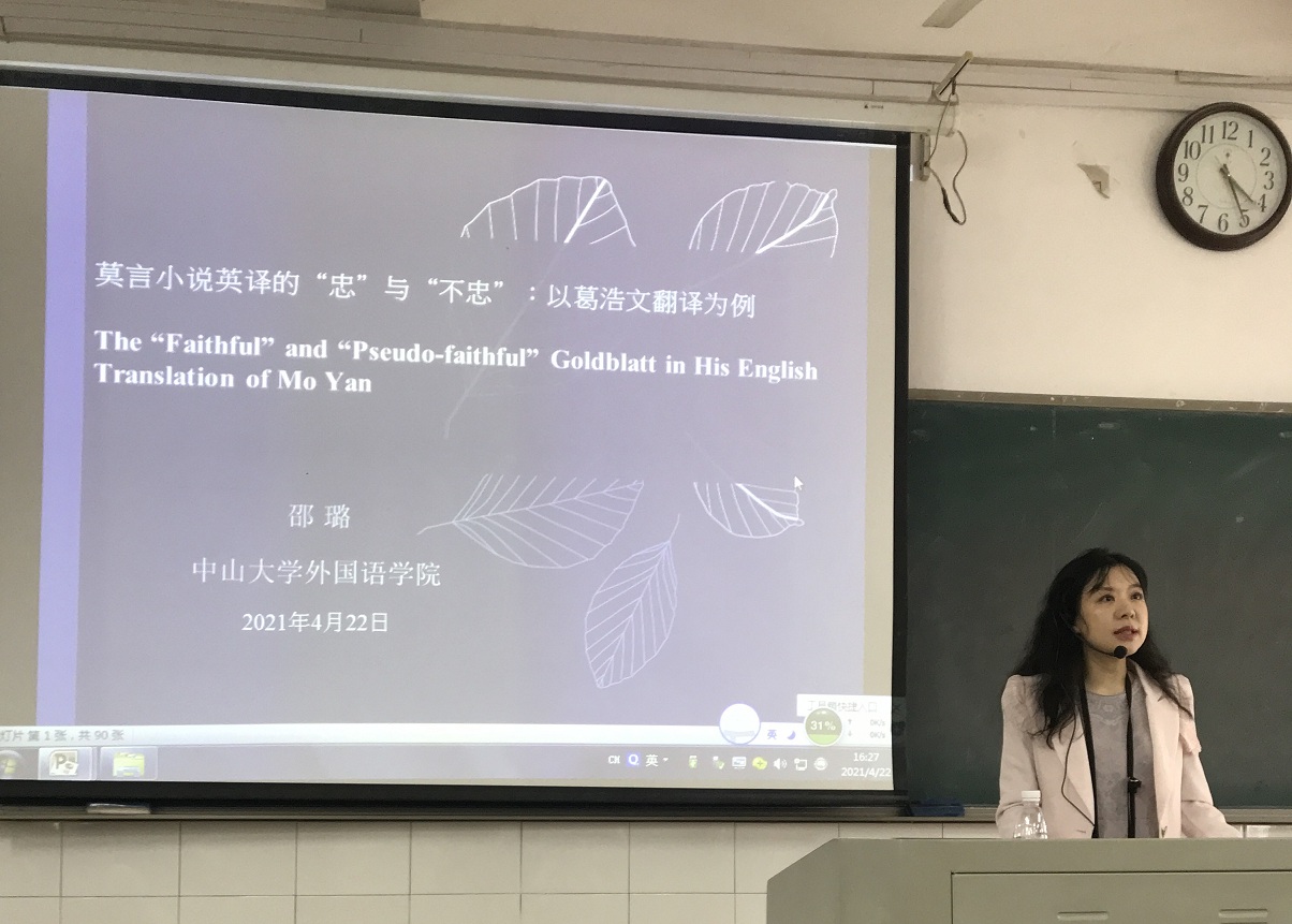 2021年4月22日下午,在怀中南301教室,中山大学邵璐教授应“乐之”论坛邀请,举行了题为“莫言小说英译的‘忠’与‘不忠’:以葛浩文翻译为例”的学术讲座。讲座由伟德国际1946源于英国副院长康响英教授主持。伟德国际1946源于英国院长刘祥清教授、翻译专业100多名师生聆听了此次讲座。