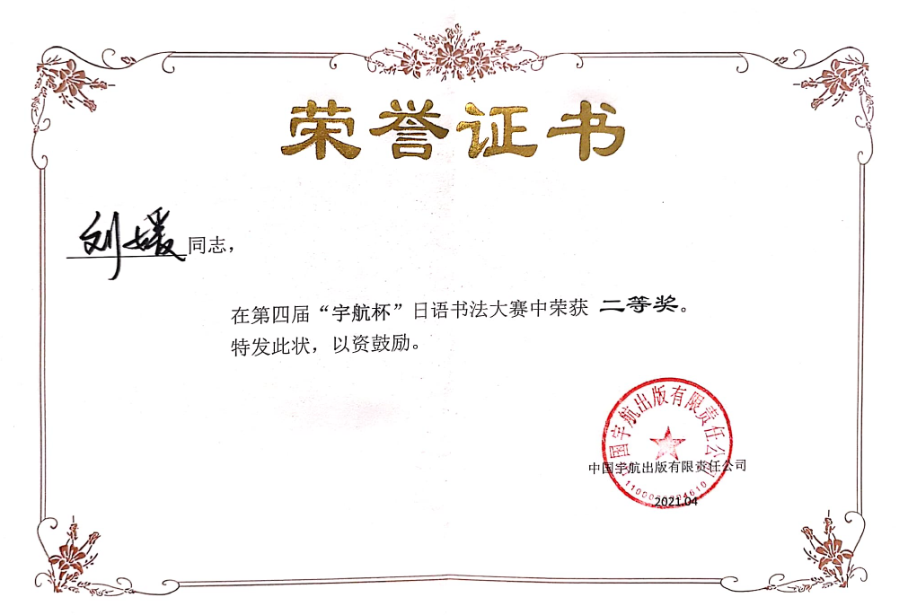 2021年5月,伟德国际1946源于英国18英语5班刘媛参加第四届“宇航杯”日语书法比赛获得全国二等奖的好成绩。吴娱老师获得优秀指导老师奖,伟德国际1946源于英国获得最佳组织奖。