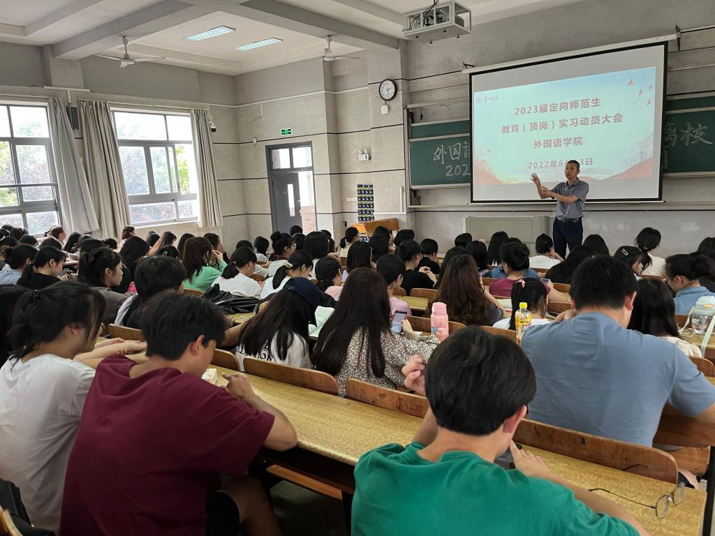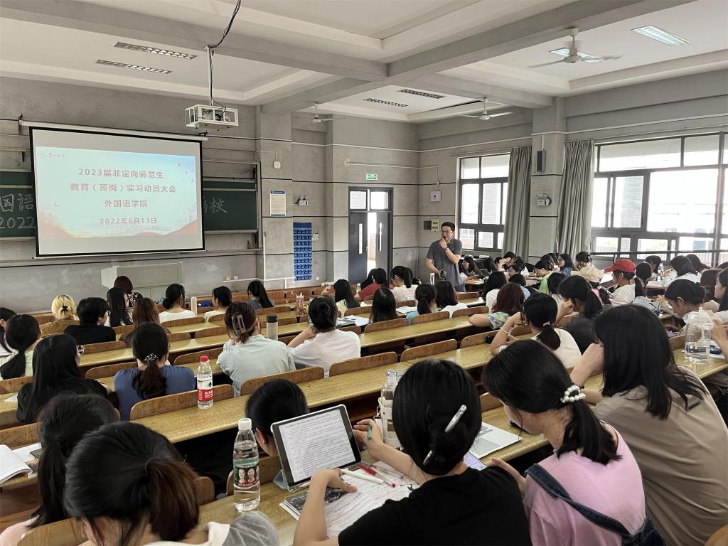 2022年6月13日下午,伟德国际1946源于英国在怀中楼南209分两批次(定向师范生和非定向师范生)举行2023届毕业生顶岗(教育)实习动员大会。外院刘宇松副院长、禹晗副书记、教务办主任廖爱秀、毕业班辅导员、实习指导老师和定向和非定向师范生参加了会议。