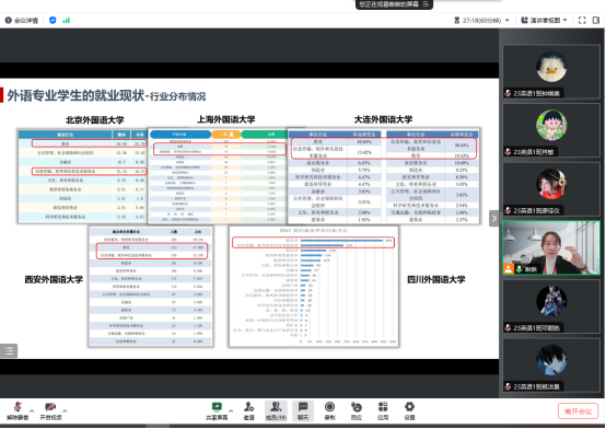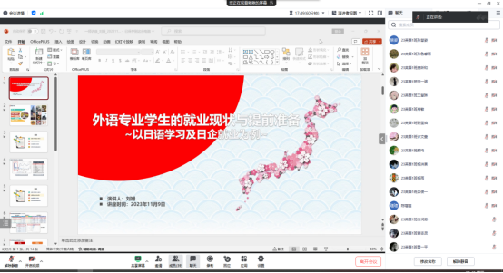 2023年11月9日晚20:30-21:30,刘珊老师线上举办了“外语专业学生就业现状与提前准备”讲座,23英语1班全体同学参加了本次线上讲座。