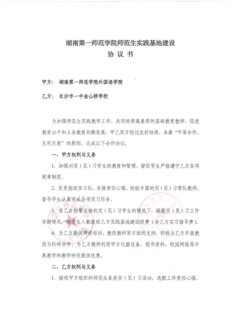 为推动协同创新,寻求合作共赢,3月26日,我院与长沙市一中金山桥学校签订教育实践基地共建协议。我院唐文杰副院长、教科办主任廖爱秀、英语系主任张昀霓和长沙市一中金山桥学校李军校长出席签约仪式。