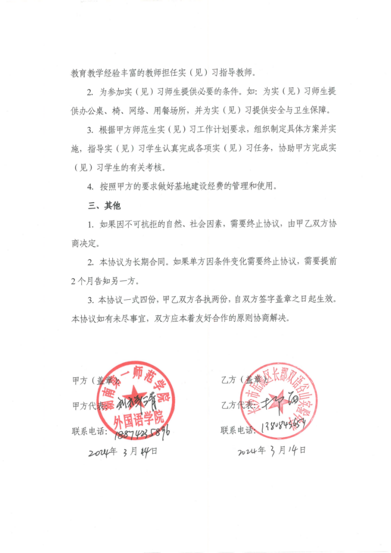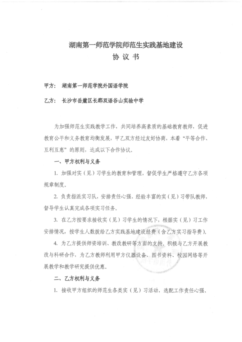 3月29日,我院与长郡双语谷山实验中学签订教育实践基地共建协议。我院教科办主任廖爱秀、英语系主任张昀霓和长郡双语谷山实验中学柳笛校长就教育实践、实践指导、实践安排等交换了意见。
