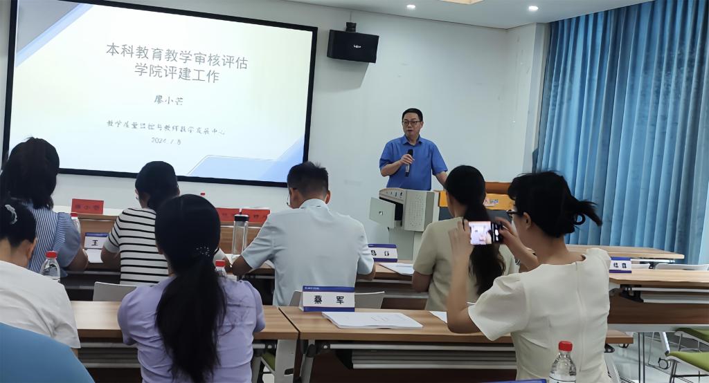 教学质量监控与教师教学发展中心主任廖小芒教授就本科教育教学审核评估学院评建工作做专题辅导。廖小芒介绍了什么是本科教育教学审核评估、新一轮审核评估的工作目标和五大原则、本科教育教学审核评估的内容,解读了评估指标体系的七个指标,分析了需要重点审核的七个项目,阐释了审核评估的相关材料和核心任务,总结了审核评估的工作要求,并勉励大家以审核评估为契机,深化本科教育教学改革,从而全面推进学校和学院高质量内涵发展、特色发展、创新发展。