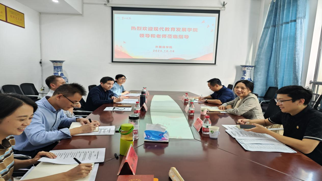 10月18日下午,现代教育发展学院院长钟佩君、副院长刘炜等一行来我院就教师培训项目管理工作进行调研。院党委书记何培森、国培项目首席专家刘明东教授、院党委副书记戴建宇、副院长王佳娣、院党委委员陈喜贝出席了调研座谈会。会议由何培森主持。