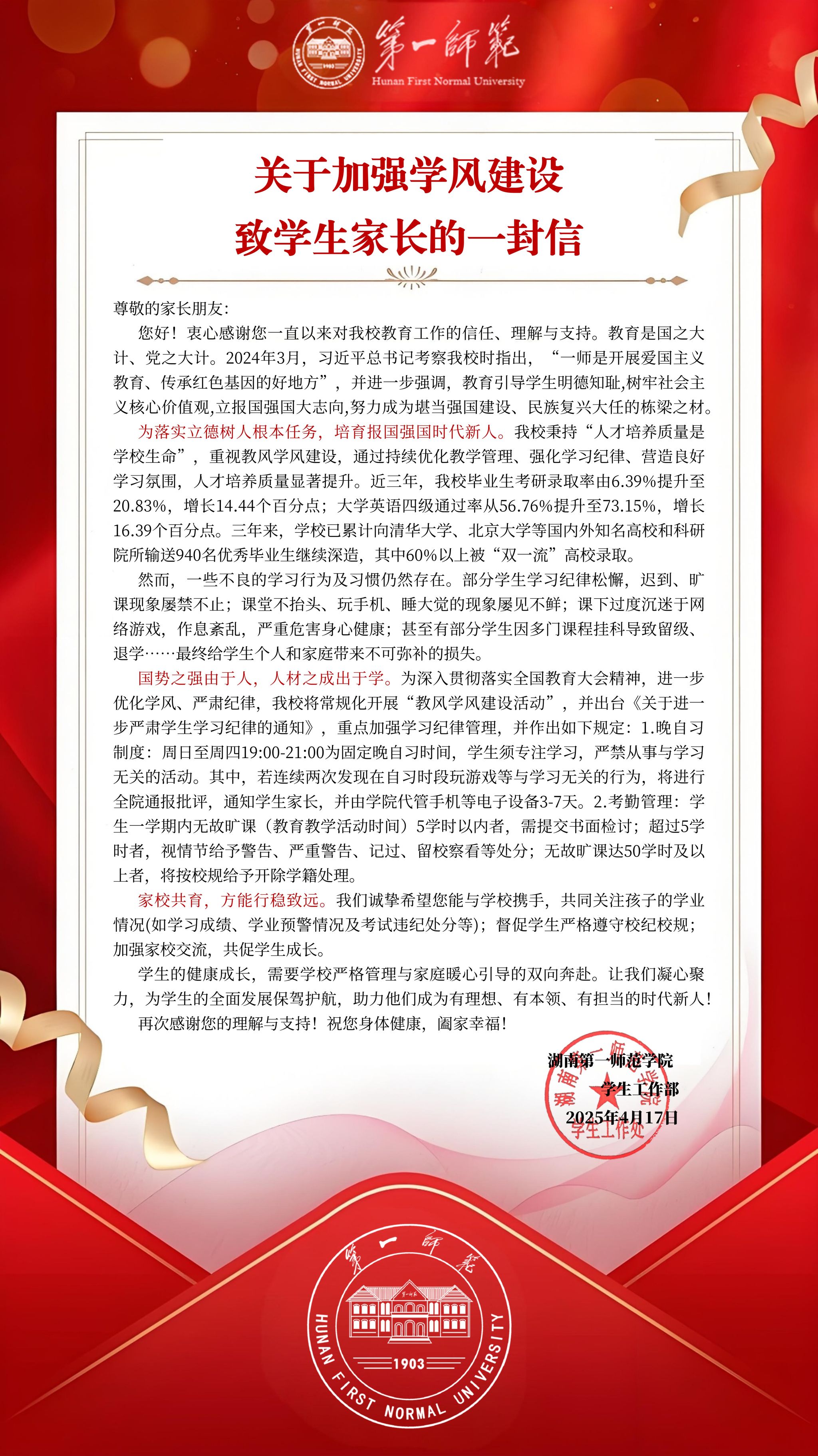 关于加强学风建设致学生家长的一封信