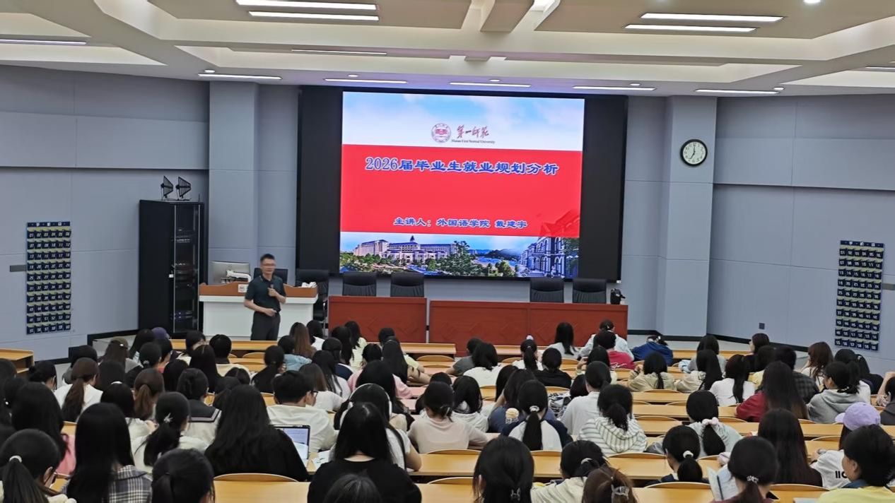戴建宇从就业形势切入,指出就业是自我独立和实现自我价值的关键,当前面临经济增速趋缓、社会对学历要求提高、教育系统师资需求减少和英语专业、翻译专业面临人工智能时代的冲击等挑战和压力。接下来在考研方面,他分析学院近两年考研数据,2024届录取 66人、2025 届录取 69人,建议学生全面分析,结合各自的实际情况理性报考;在考编方面,因近年来教师岗位竞争激烈,部分区县教育局对英语教师需求仅个位数,除了具备扎实的理论功底外,还需重视和提升教师技能实践能力和教育教学基本功。对于每一位毕业生要转变就业观念,不要局限就业地域选择,要积极拓宽就业岗位的选择,鼓励大家先就业再择业。
