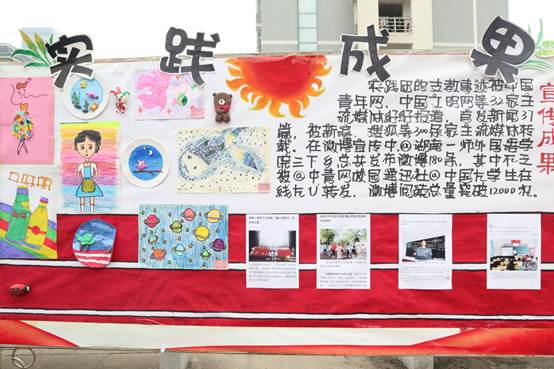 我院三下乡成果展分别展出了“特色活动”、“实践成果”、“历年荣誉” 和 “留言板”几大板块,展板上陈列了队员们的照片、优秀教案、书法和手工作品以及孩子们的美术画、工艺品。活动现场气氛热烈,队员们通过歌舞表达对观展人员的欢迎与感谢,留言板上满是院领导及各学院同学留下的祝福。