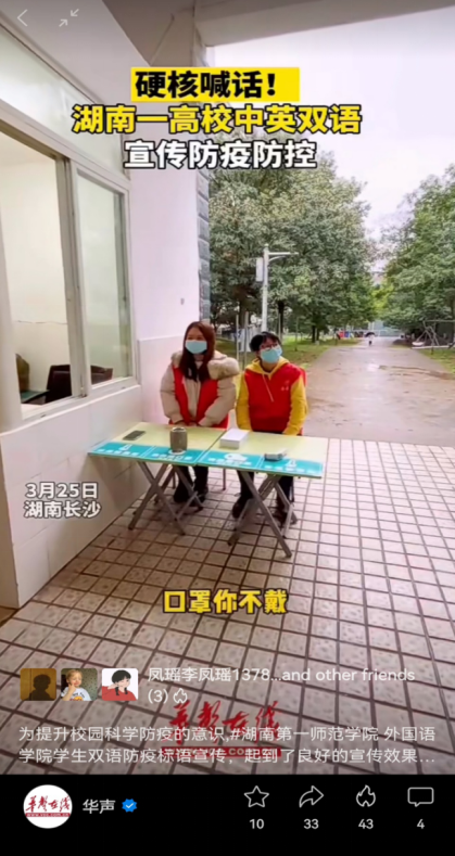 公寓门口喇叭声中循环播放的多语言防疫口诀也不难让人看出该院对此次疫情防控宣传的重视。“进出公寓请佩戴好口罩”“Please wear a mask when entering or leaving the apartment”……从汉语、英语到日语、韩语,从普通话到方言,一句句极具亲和力又彰显了外院特色的口号,温暖了每一位外院学子的心。