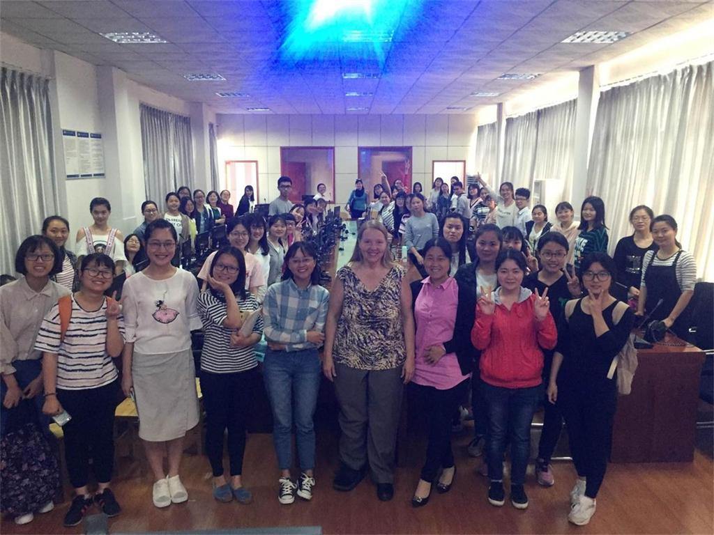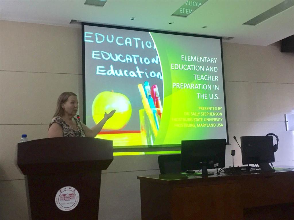讲座的题目是“Elementary Education and Teacher Preparation in the U.S.”。Stephenson教授先后介绍了美国小学教育的发展历史与阶段教学目标,并以其所在的大学为例生动地描述了大学社团组织及美国大学培养小学教师的课程体系与实施过程。讲座最后设有提问环节,外院师生就中西方课堂差异、教学过程的信息技术的运用、以及提高学生学习兴趣的方法等内容积极向Stephenson教授提问,她结合自身在中国调研的亲身经历,用全球化的眼光生动地解答了师生们的疑惑,并获得了外院师生的一致好评。此次讲座为外院师生打开了一扇了解美国大学师范教育的窗户,加深了师生对美国小学教育的了解。