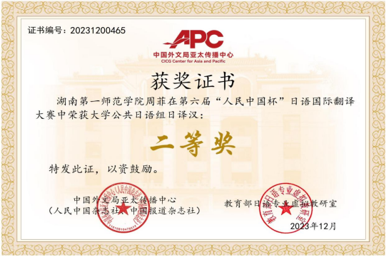 近日,由中国外文局亚太传播中心和教育部日语专业虚拟教研室联合主办的第六届“人民中国杯”日语国际翻译大赛成绩揭晓,我校学子经过激烈竞争,取得优异成绩。