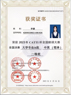 2023年8月16日,CATTI杯全国翻译大赛决赛全国决赛成绩揭晓,我们学院李谦、侯佳源同学荣获中英笔译大学A组二等奖。在之前进行的省赛中,我校选手李谦、侯佳源、蔡佳珺、庞姝妍、石晶怡、冉林鑫、左雅钰7名同学荣获一等奖,帅莉、陈昕妍、佘奕涓、周嘉怡、韩非宏、习雨亭6位荣获二等奖,获一等奖和二等奖的13位同学入围中英笔译大学A组全国决赛。13位同学的指导老师是翻译系陈钰、毛晔、张丽红、曾昭艳、胡靓、吴娱、周超英等老师。
