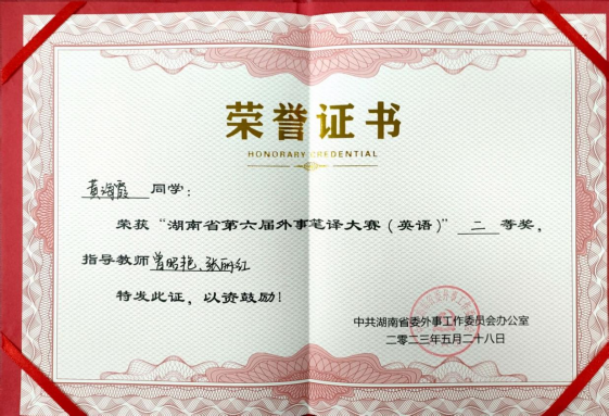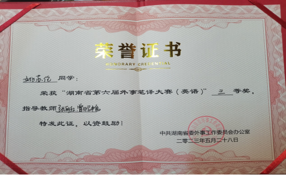 2023年5月28日,湖南省第六届外事笔译大赛在中南林业科技大学举行,来自湖南省26所高校的148名选手“译”决高下。我院黄海霞、姚苏伦、苏蔚3名同学代表学校参加了此次大赛,与来自中南大学、湖南师范大学等一本院校的研究生本科生同台竞技。经过中译英和英译中两场精彩激烈的比拼,2019级翻译1班黄海霞、20级英语3班姚苏伦获外事笔译(英语)大赛二等奖和三等奖。