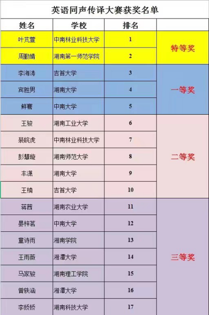 本次大赛由中共湖南省委外事工作委员会办公室主办,中南林业科技大学承办,旨在为推动湖南省外向型经济的发展储备高级外事翻译人才,促进湖南省高级翻译人才的培养。成绩的取得是选手努力付出,指导老师罗亦陶、张丽红精心培养的结果,体现我校在外语专业人才培养质量的提高,是外院为“品质一师”所做出的新贡献。
