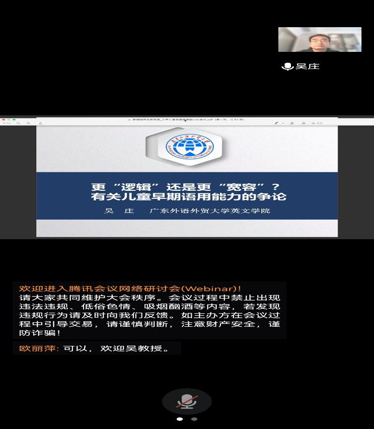 2022年4月19日(星期二)下午,广东外语外贸大学吴庄教授应“乐之论坛”邀请,为我院师生做了一场题为“更‘逻辑’还是更‘宽容’?有关儿童早期语用能力的争论”的线上学术讲座。讲座由康响英副院长主持,全院100多名师生聆听了此次讲座。