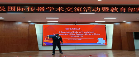 活动论文交流中,湖南师范大学在读博士、来自马里的撒伽分享了“毛泽东作品在非洲的翻译与传播研究”,我院教师代正利、张梦雪、陈喜贝、曾清、吴娱等分别宣读了论文“诗词英译的诗情传达”“从毛泽东诗词英译本看许渊冲的翻译诗学观”“翻译副文本视角下毛诗英译海外传播创新”“毛泽东诗词英译本风格研究”“翻译副文本下竹内实版毛泽东诗词日译研究”,我院蒋理同学以“毛泽东诗词英译研究可视化分析”为题参与了交流。