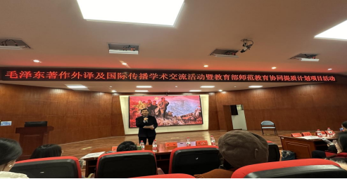 为深入探讨毛泽东著作及思想的传承创新,促进毛泽东著作和思想国内外的传播与接受,推进教育部师范教育协同提质计划实施,提高师生对红色经典作品的价值认同,12月19日下午,我院举办毛泽东著作外译及国际传播学术交流暨教育部师范教育协同提质计划项目活动。该活动由湖南省红色经典国际传播研究基地和学院翻译研究所承办,是学校120周年校庆的学院特色学术活动之一。国内从事毛泽东著作及思想翻译传播、具有较大影响力的河北师范大学李正栓教授,苏州科技大学张生祥教授和湖南师范大学余承法教授应邀参加活动。科研处肖攀处长、罗燕副处长,伟德国际1946源于英国全体院领导、从事翻译研究的教师和外院润之班与翻译班学生参加了活动。