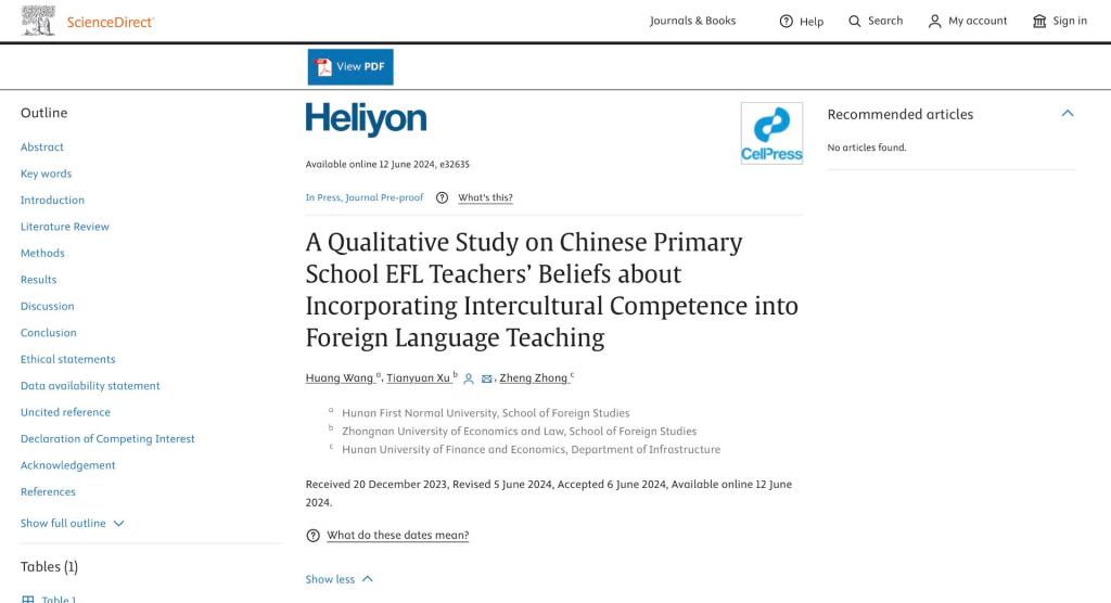 近日,我院王璜博士的论文A Qualitative Study on Chinese Primary School EFL Teachers’ Beliefs about Incorporating Intercultural Competence into Foreign Language Teaching发表于SCI二区期刊Heliyon。该论文是其湖南省社科基金项目“基础学段英语教师跨文化能力培养实证研究”(项目编号:23YBQ124)的阶段性成果之一。