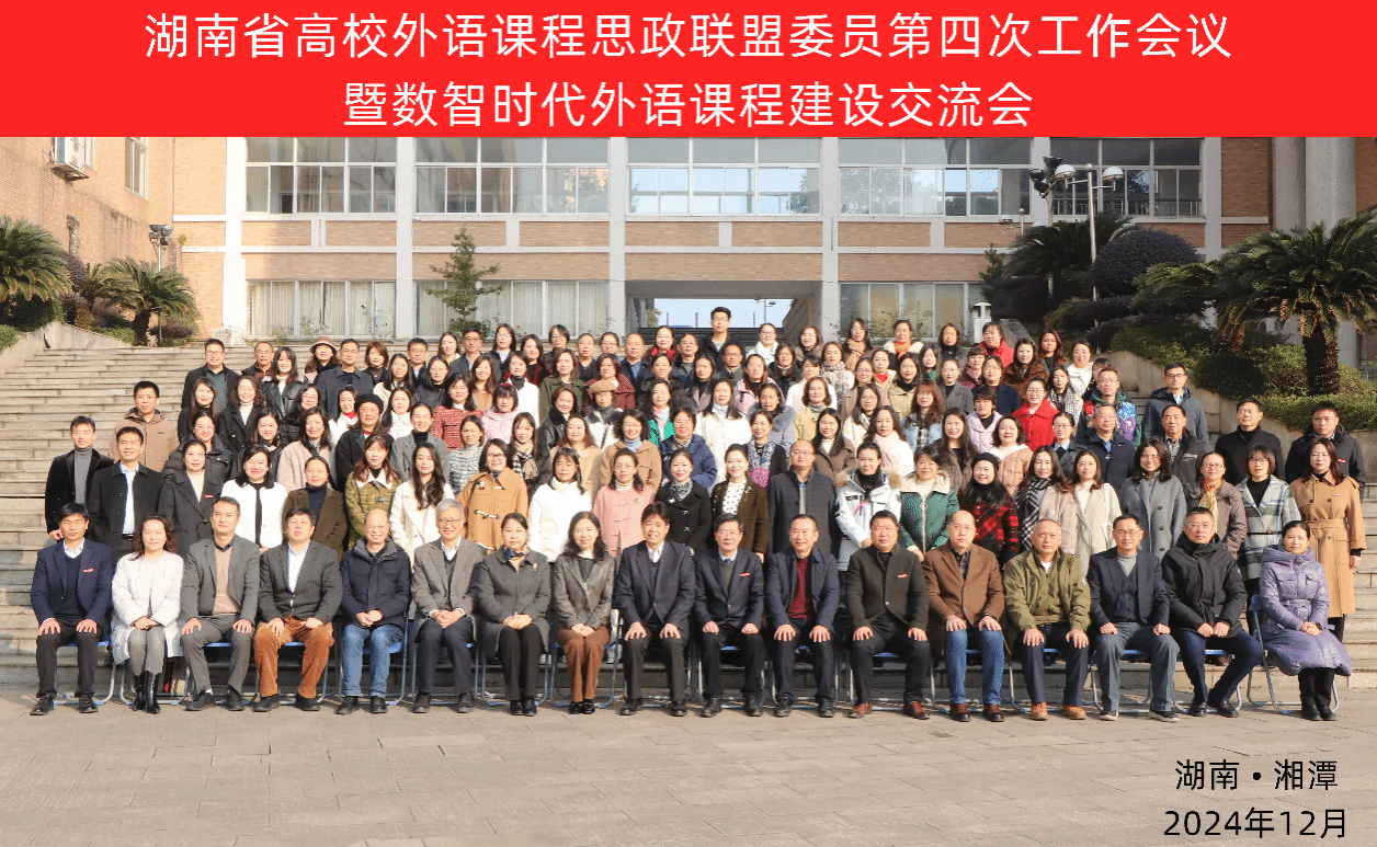 2024年12月28日,由湖南省普通高校大学外语教学指导委员会、湖南省高校外语课程思政联盟主办,湖南工程学院、高等教育出版社承办的“湖南省高校外语课程思政联盟委员第四次工作会议暨数智时代外语课程建设交流会”在湘潭顺利召开,来自全省86所本科及高职院校的120余名联盟委员及教师代表参加了此次会议。我院联盟委员陈艳君副院长、刘祥清教授、陈喜贝副教授、钟玲俐副教授应邀参会。