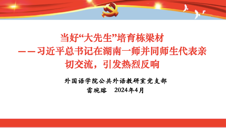 4月8日晚,公共外语第一、二教研室和党支部举行专题学习会,全面系统学习了习近平总书记考察我校时的重要讲话,在深学细悟中领会习近平总书记的讲话精神。学习活动由公外部党支部书记雷琬瑢主持,公共外语第一教研室主任罗海艳、第二教研室主任曾碧峰,支部委员魏艳、陈迎、梁薇等先后领学并做主旨发言。