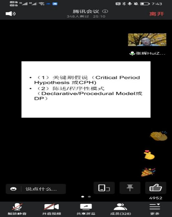 2022年4月14日(星期四)晚上,我国著名学者张辉教授应我院“刘明东中、小学英语学科导师工作坊”邀请,为我院师生做了一场题为“二语习得和加工假说:观点、证据与分歧”的线上学术讲座。讲座由刘祥清书记主持,刘宇松副院长等党政领导与300多名师生聆听了此次讲座。