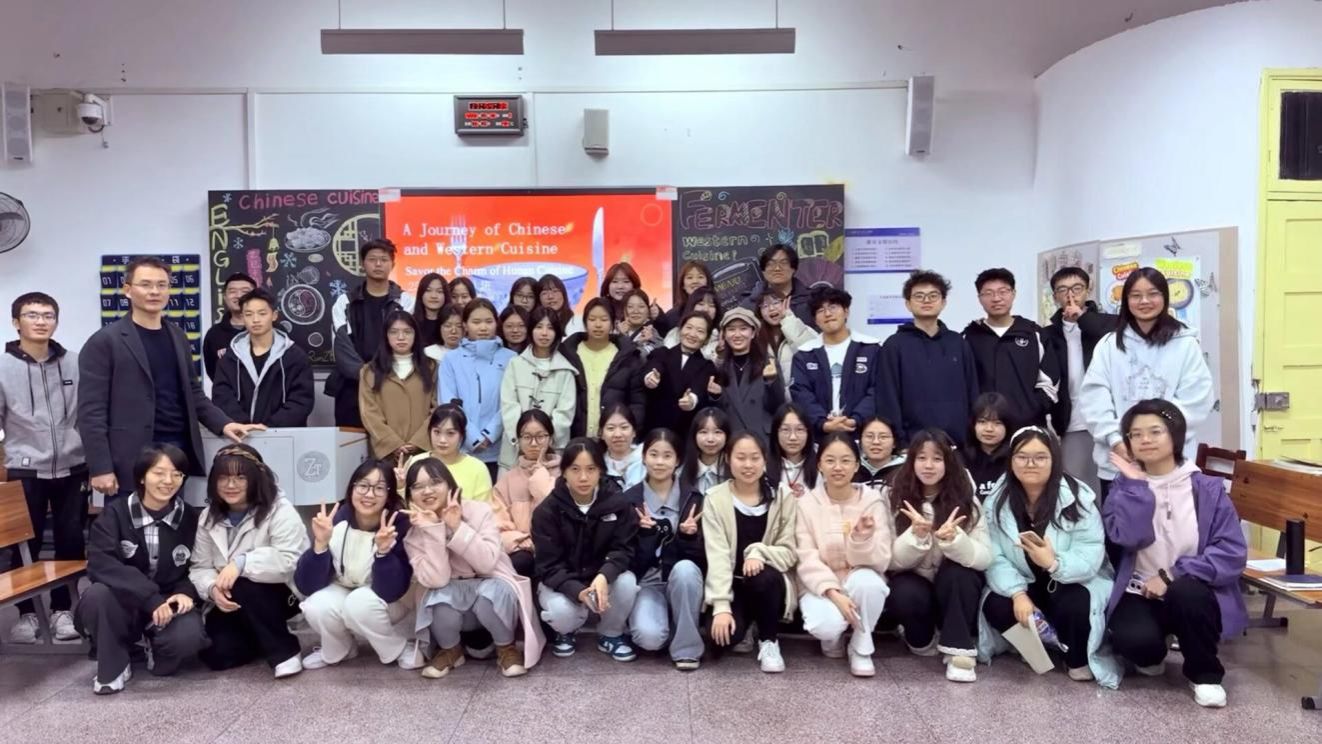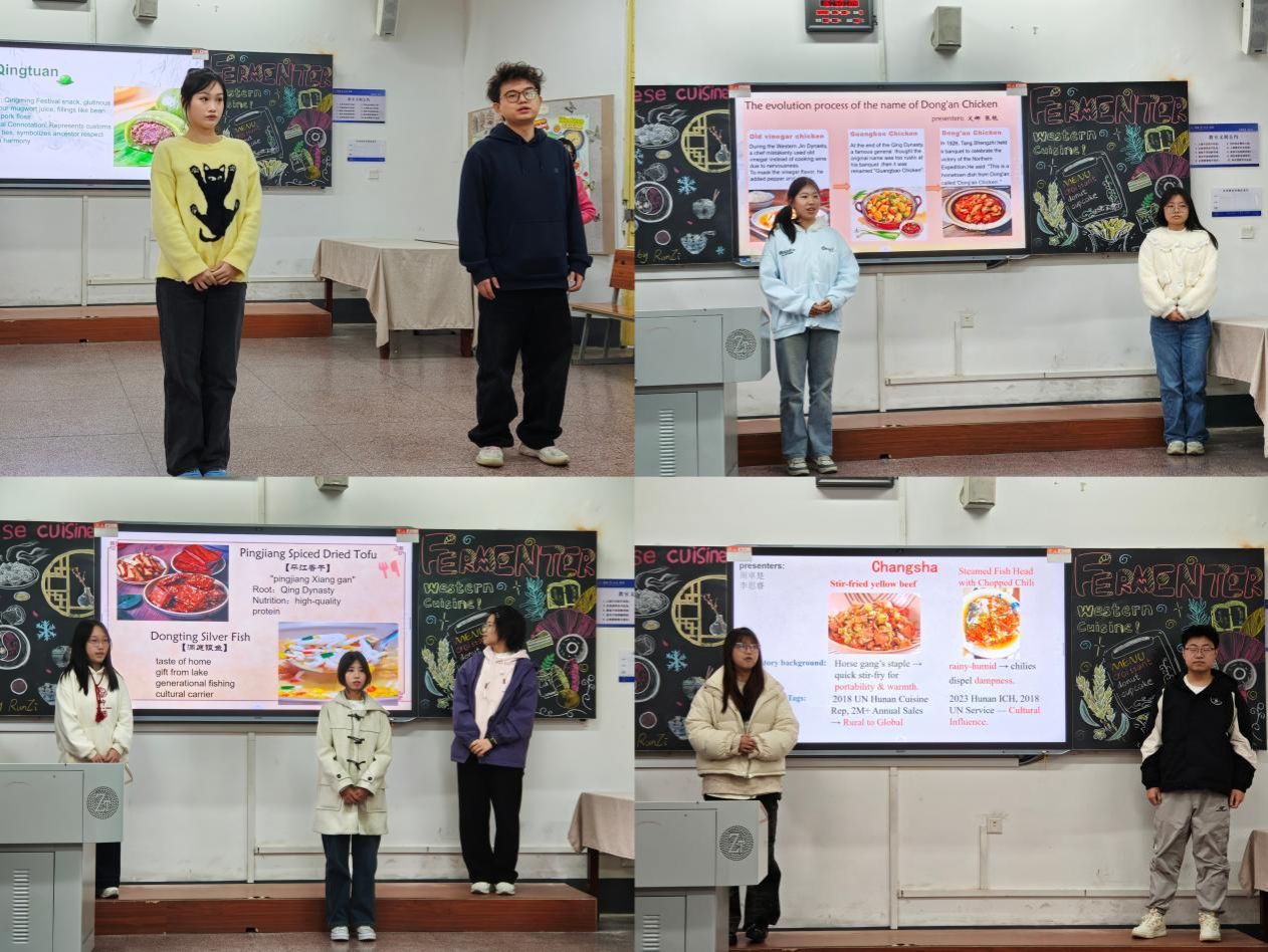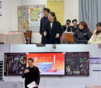 在世界美食分享落幕之际,主持人手持精心准备的抽奖箱登场,邀请现场嘉宾及同学轮流抽奖确定分享顺序,现场充满期待与欢笑。随后,同学们依次以英语深入阐释中国八大菜系的独特魅力:包含川菜“麻辣鲜香”的层次解析,粤菜“清鲜嫩爽”的本味追求,鲁菜作为北方代表的厚重渊源,以及苏菜淮扬风味的精致工艺。同学们结合经典菜例与文化背景,生动传递出中餐的烹饪智慧与饮食哲学。