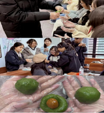 在中西方美食分享环节结束后,陈美旭同学作为互动环节主持人,详细介绍了青团的历史渊源与制作方法,现场师生一同动手制作青团。通过揉面、包馅、塑形,在一阵阵欢声笑语中,一颗颗包含板栗、紫薯、咸蛋黄等馅料的青团逐渐成型。同学们在动脑与动手之间,深化了对饮食智慧与传统节俗的理解,让英语交流融入了这份烟火气十足的实践场景中,也让现场氛围达到了高潮。