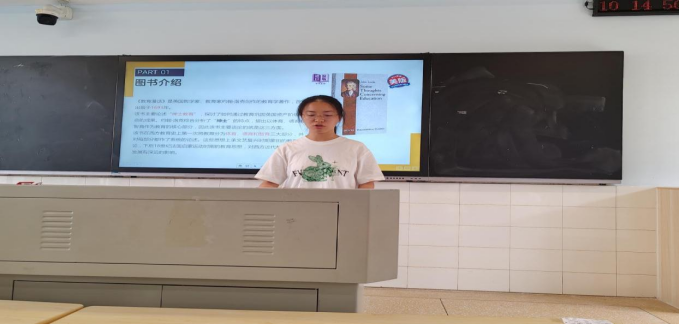 随后的阅读分享环节中,每组学生依次上台,分享自己所阅读的书籍及体会。在分享中,学生们主要对《教育心理学》《教育漫谈》《教育的目的》等教育名著进行了介绍与分析,并展示了他们在阅读中的独特见解与思考。