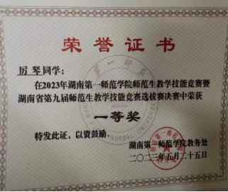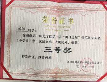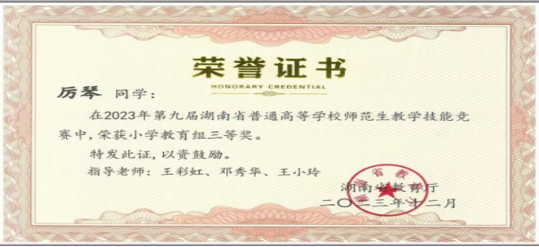 厉琴获湖南省第九届普通高等学校师范生教学技能竞赛小学教育组三等奖、伟德国际1946源于英国第九届师范生教学技能竞赛一等奖及第三届“明日之星”师范生技能比赛三等奖。